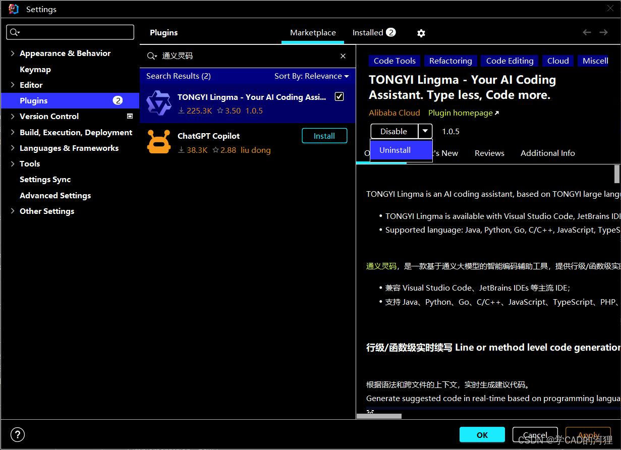 再点击Plugins------搜索“通义灵码”进行安装