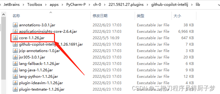 3- 打开你的编辑器插件目录下的github-copilot-intellij\lib (找不到的可以用everything 搜一下)把刚才的 core-1.1.20.jar 替换掉这个 core-1.1.26.jar (记得把名称修改为刚才替换的)