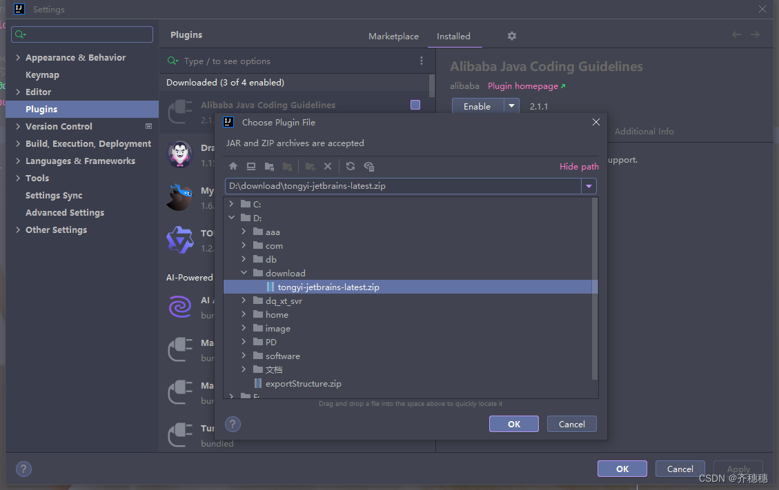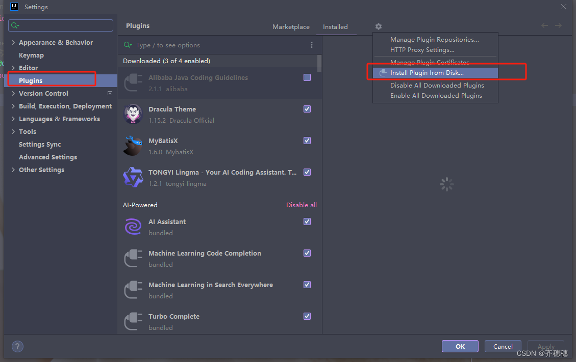 4)点击Install Plugin from Disk,选择下载的zip文件,完成后点击ok