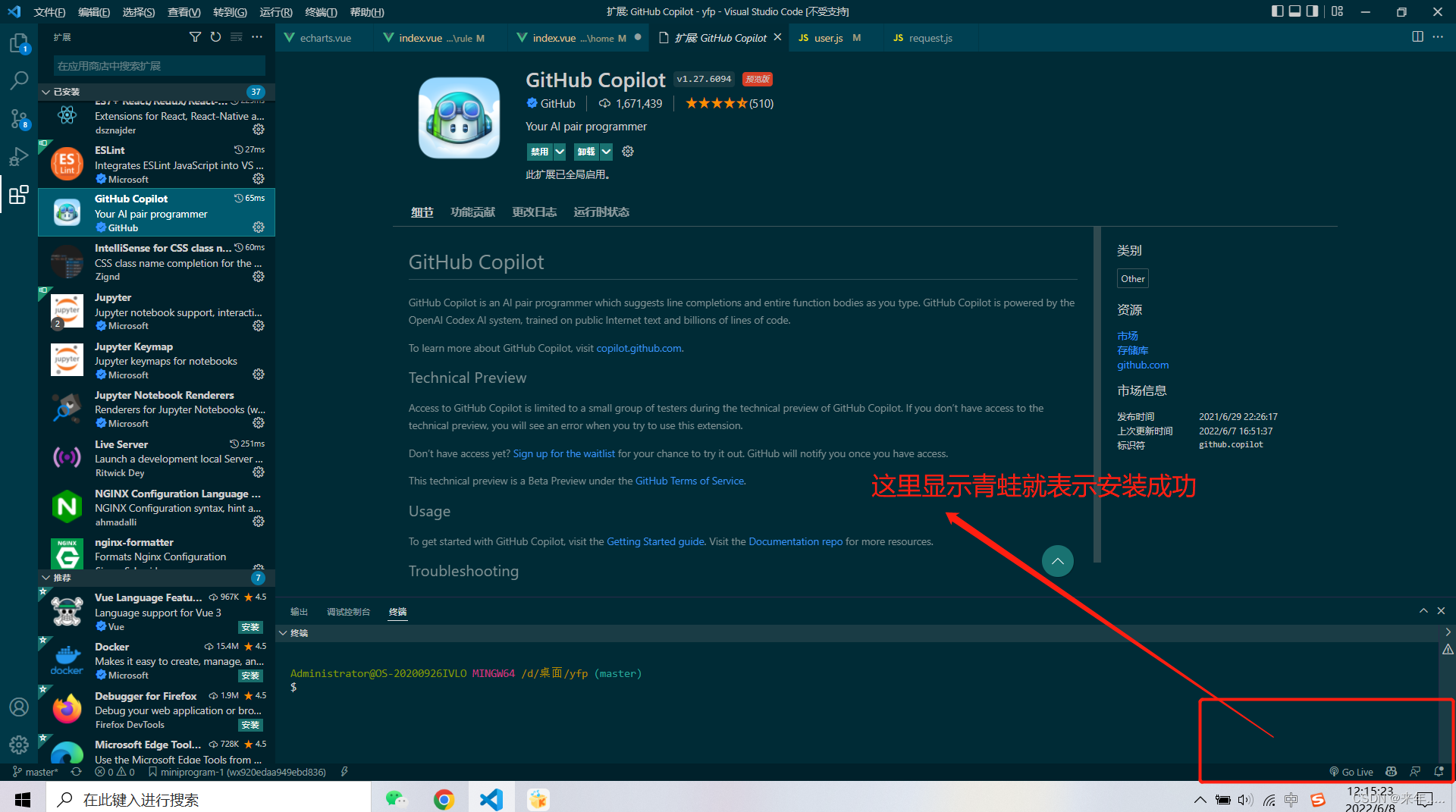 5.下载完之后他会让你登录github登录上去就好了,安装成功之后右下角会显示青蛙