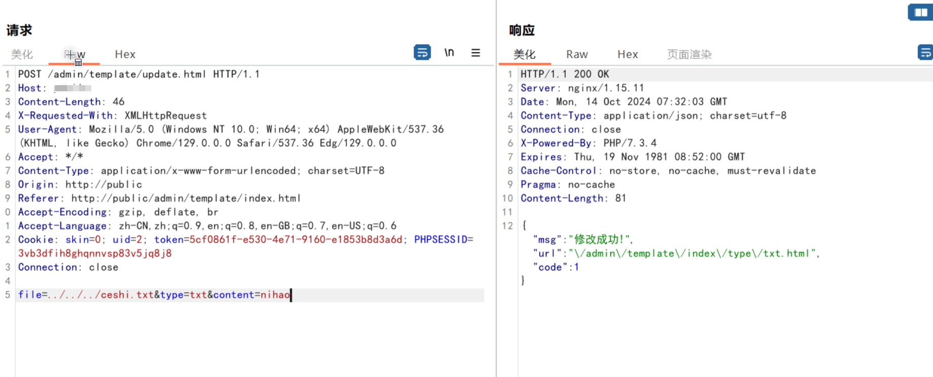 但注意,此处原请求type值为空,file文件后跟上后缀.html,但如果要任意文件修改,则必须指明type类型,不能为空,在file后也要写文件的全名(包括后缀)