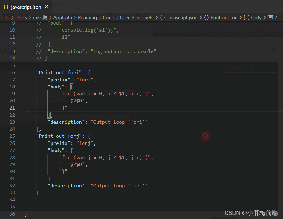 prefix 冒号里填的是 在 Intellisense 中选择代码片段时将使用的前缀,即你要打出的快捷键。print to 后面填的是你这个代码块的名字 随便取 符合命名规则就行。description 冒号后面填的是 这个代码段的描述 随便写就行。美元$符号+数字代表光标位置 即你打出代码段后光标所在的位置。有提示 不用打全就行 (会有javascript选中)body 冒号后面填的是你要定义