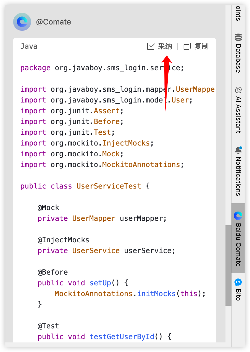 右边会唤起 Comate,代码注释生成之后,点击采纳,注释就会自动添加到方法里边。