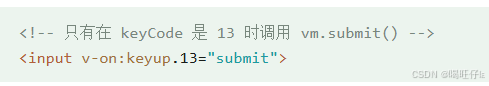 <!-- 阻止单击事件冒泡 --> <a v-on:click.stop="doThis"></a> <!-- 提交事件不再重载页面 --> <form v-on:submit.prevent="onSubmit"></form> <!-- 修饰符可以串联 --> <a v-on:click.stop.prevent="doThat"></a> <!-- 只有修饰符 --> <form v-on:submit.prevent></form> <!-- 添加事件侦听器时使用事件捕获模式 --> <div v-on:click.capture="doThis">...</div> <!-- 只当事件在该元素本身(而不是子元素)触发时触发回调 --> <div v-on:click.self="doThat">...</div> <!-- click 事件只能点击一次,2.1.4版本新增 --> <a v-on:click.once="doThis"></a>按键修饰符:Vue 允许为 v-on 在监听键盘事件时添加按键修饰符: