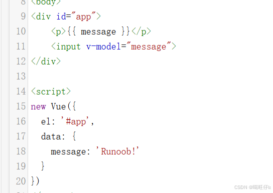 用户输入:在 input 输入框中我们可以使用 v-model 指令来实现双向数据绑定: