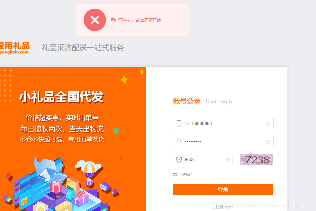输入验证码后点击登陆,提示用户不存在,或密码不正确。