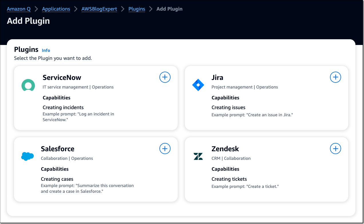 还可以连接管理企业系统访问权限的插件,包括ServiceNow、Jira、Salesforce和Zendesk。插件使Amazon Q能够执行用户请求的任务,例如创建支持单或分析销售预测。