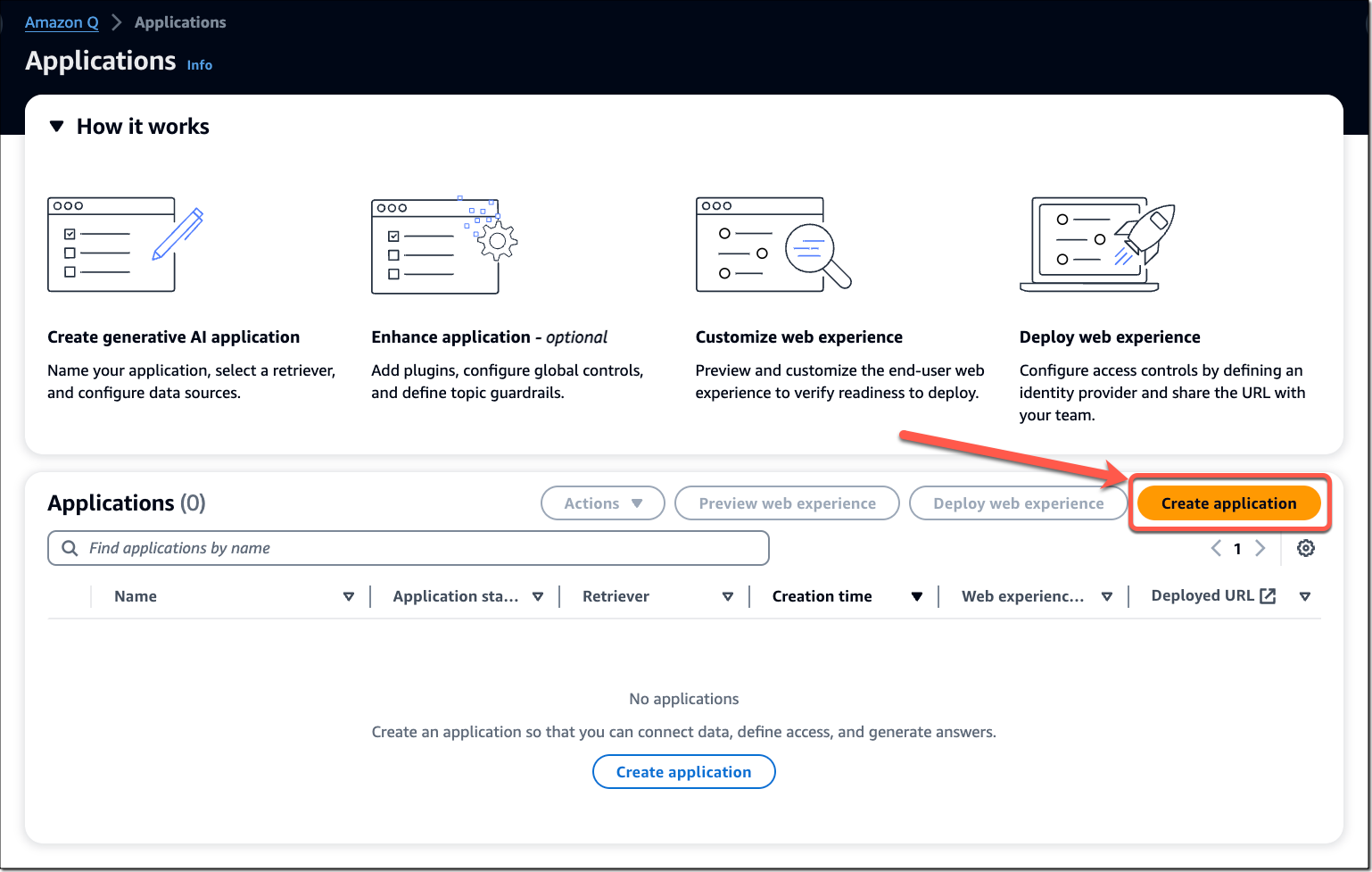 要为企业量身定制Amazon Q,请导航到控制台中的Amazon Q,在左侧菜单中选择应用程序,然后选择创建应用程序。