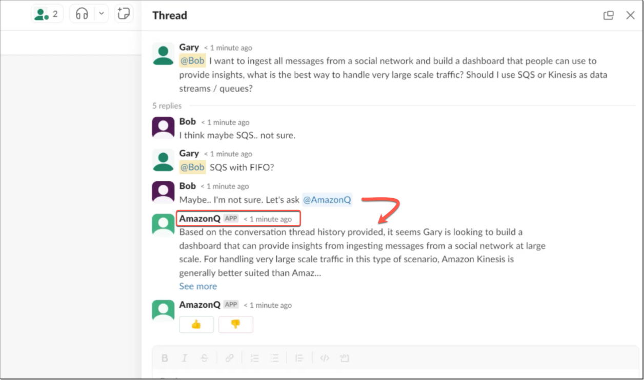另请查看Amazon Q Slack网关GitHub存储库,其中介绍了如何将Amazon Q作为Slack Bot应用程序供用户使用。