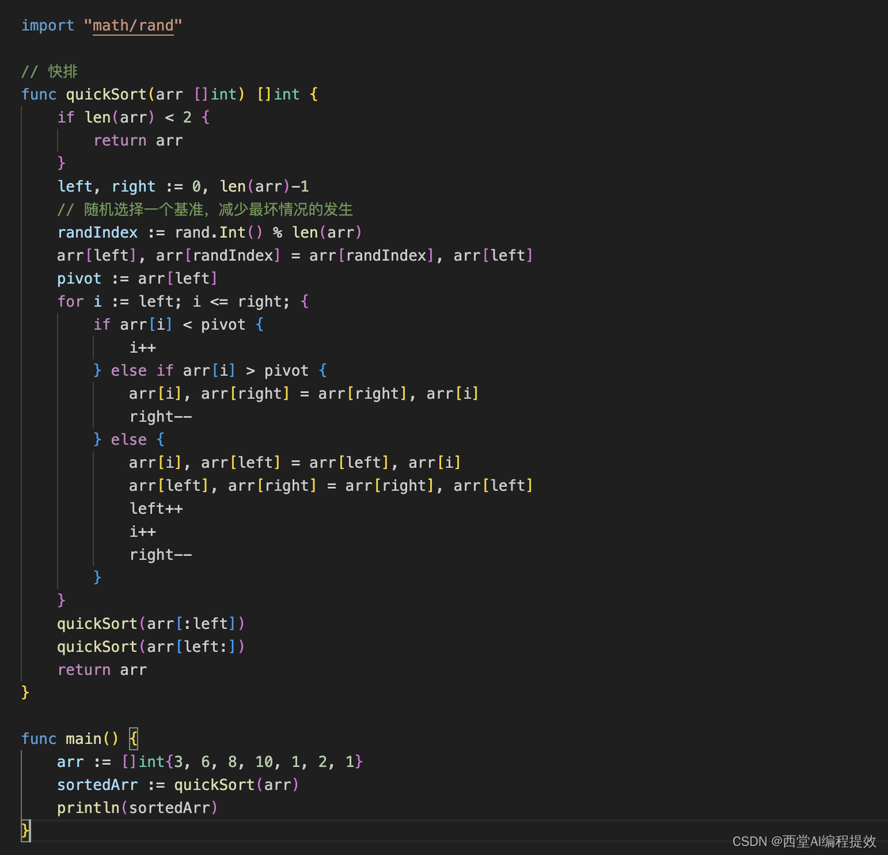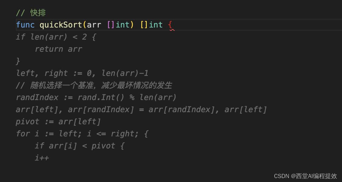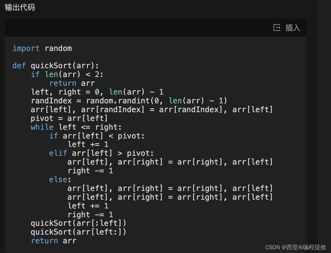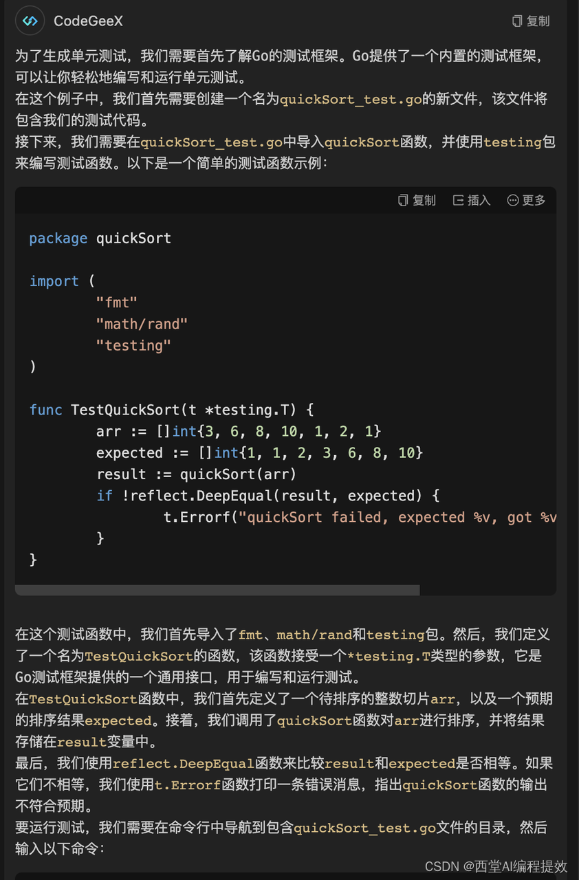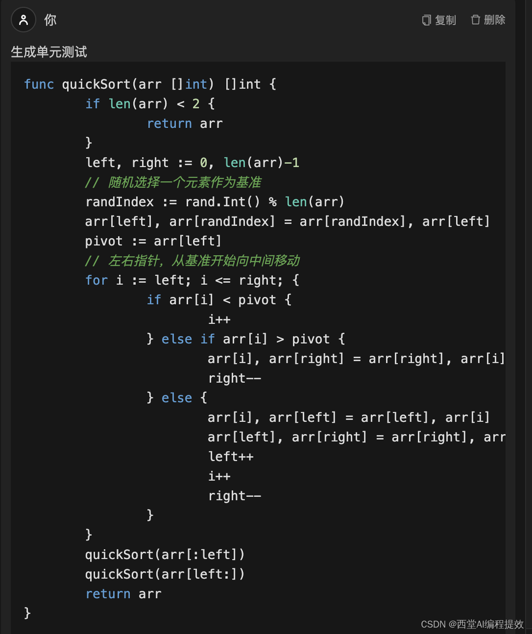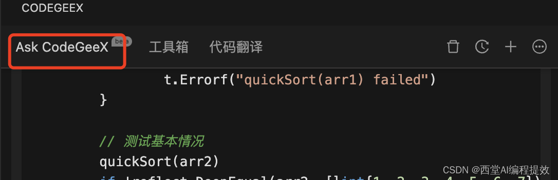 我们可以借助CodeGeeX来快速生成单元测试;选中quickSort函数,输入:单元测试