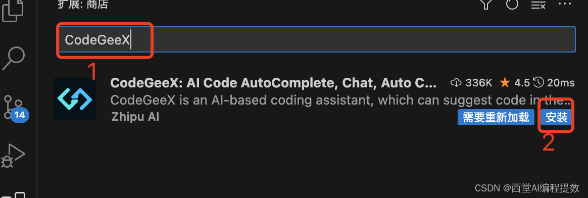 使用vscode编辑器,在插件中搜索CodeGeeX,点击安装