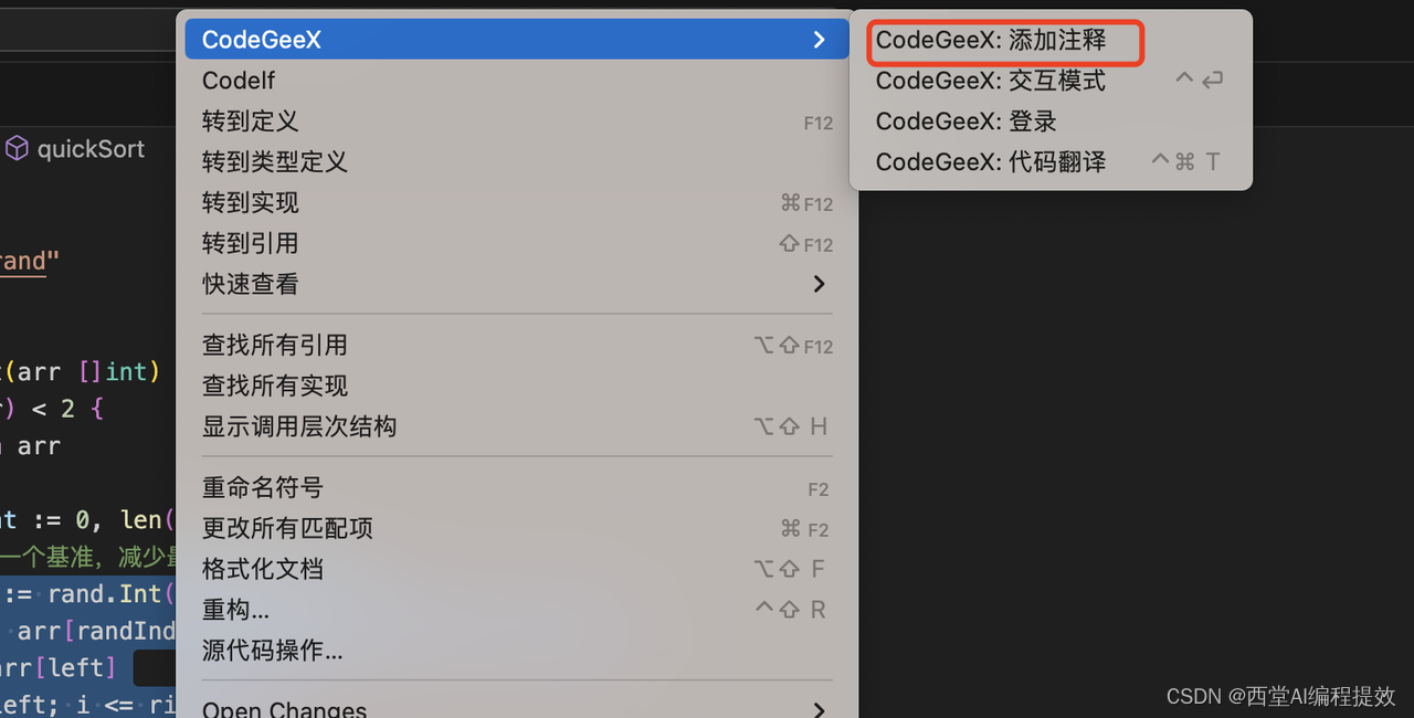 右键选择CodeGeeX->添加注释,即可对该部份代码进行注释。