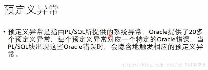 预定义异常处理预定义异常的列表 :错误号异常错误信息名称说明ORA-00001 DUP_VAL_ON_INDEX试图破坏一个唯一性限制 ORA-00051TIMEOUT_ON_RESOURCE在等待资源时发生超时ORA-01001INVALID_CURSOR 试图使用一个无效的游标ORA-01012 NOT_LOGGED_ON没有连接到ORACLEORA-01017LOGIN_DENIED无效的.