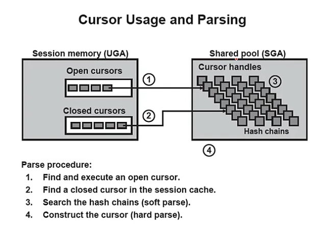 有一条sql与游标相关联,并将执行解析过后的执行计划放在library cache(SGA的shared pool下)中,UGA中生成指向这个共享游标的指针;即session cursor 指向shared cursor。 一个session cursor 只能指向一个shared cursor,而一个shared cursor 可以指向多个session cursor。