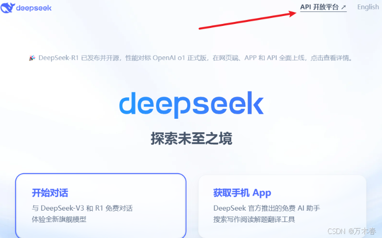 通过 [DeepSeek 官网](DeepSeek | 深度求索),手机号或者微信注册后,点击右上角 API开放平台;