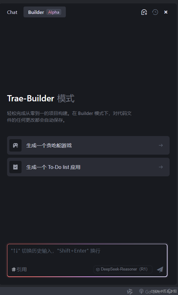 * 启动与项目生成 :点击界面右上方区域的 “+”> 选择默认配置文件,选择带有 PowerShell{版本号}xxx 字样的配置文件。使用快捷键(macOS:Command + U;Windows:Ctrl + U)打开侧边对话框,在侧边对话框的左上角,点击 Builder,即可进入 Builder 模式。在该模式下,你只需在输入框中用自然语言描述项目需求,例如 “请用 React 生成一个 Todo List 应用”,Trae 会自动分解任务、生成代码框架,甚至优化部署流程 。
