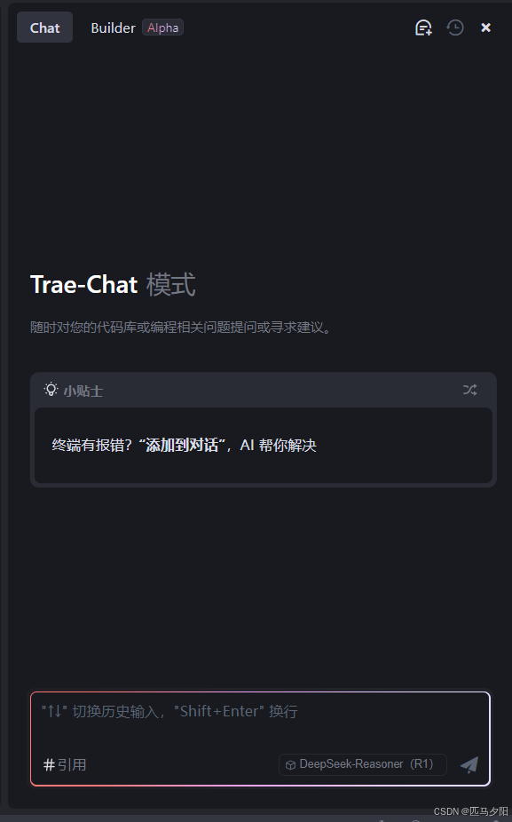 - 启动与交互 :使用快捷键(macOS:Command + I;Windows:Ctrl + I)打开侧边聊天窗口,即可进入 Chat 模式。在对话框中输入问题或代码需求,Trae 会基于 AI 模型生成代码建议或解答。例如,你可以输入 “如何实现一个轮播图功能”,Trae 会给出相应的代码示例和解释 。