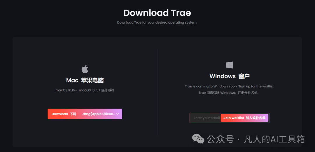 2、Trae 目前只推出了国际版,而且没有Windows版本,想使用得输入邮箱加入排队。