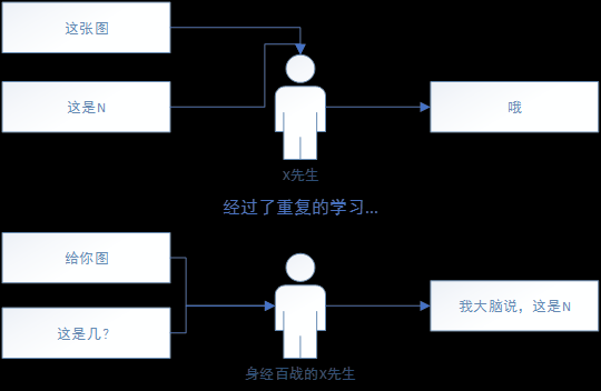 通过上面的例子,我们已经明白,假设存在一个人工智能,我叫X先生,他的作用不过是把曾经 输入 与 输出 的关连复习好,当我们展现给他 输入 时,他就会告诉我们,根据他的学习,此时应该出现的结果应该是……