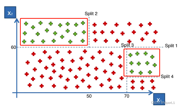 分类决策树原理:对平面进行不断分割(直至所有类被分开)