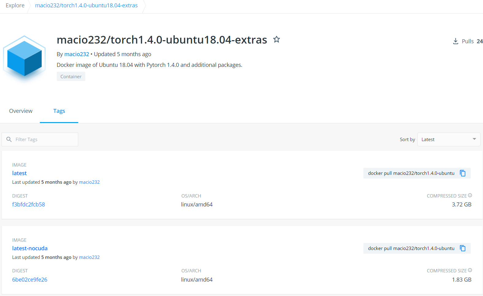 可以在https://hub.docker.com/search?type=image上搜索想要的基础镜像文件,点击镜像页面上的Tags复制镜像下载命令,此处选择带有pytorch和ubuntu环境的镜像: