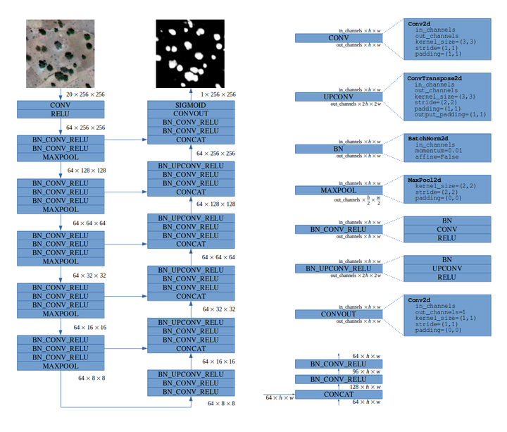在典型的卷积神经网络(CNN)结构中,通常会在每次最大池化操作后增加特征图谱(卷积通道)的数量。在我们的模型中,我们决定在整个网络中保持特征图谱始终为64个。这样做出于以下两个因素:首先,我们可以允许网络在进行下采样操作时丢失一些信息,因为该模型在上采样过程中已经可以得到相关低级特征。其次,在卫星图像中,不需要去理解和识别高层次3D物体的概念,因此,在较高网络层中增加特征图谱的数量,可能并不会影响到该模型的实际预测性能。