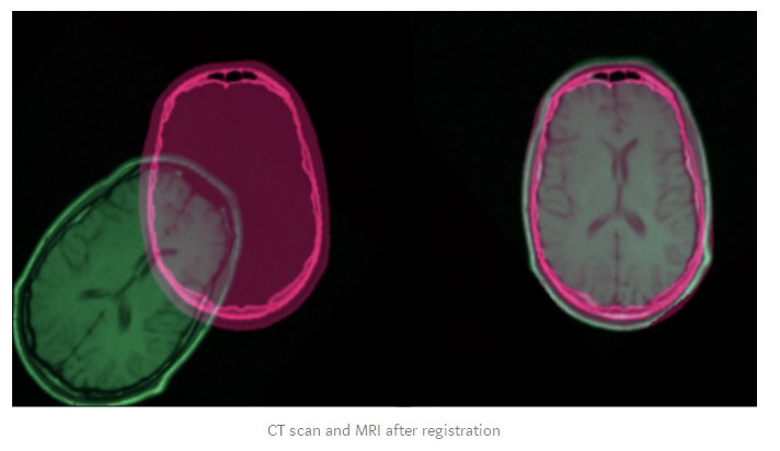 A significant proportion of current research in image registration concerns the field of medical imagery. Often times, the transformation between two medical images cannot simply be described by a homography matrix because of the local deformations of the subject (due to breathing, anatomical changes, etc.). More complex transformations models are necessary, such as diffeomorphisms that can be represented by displacement vector fields.