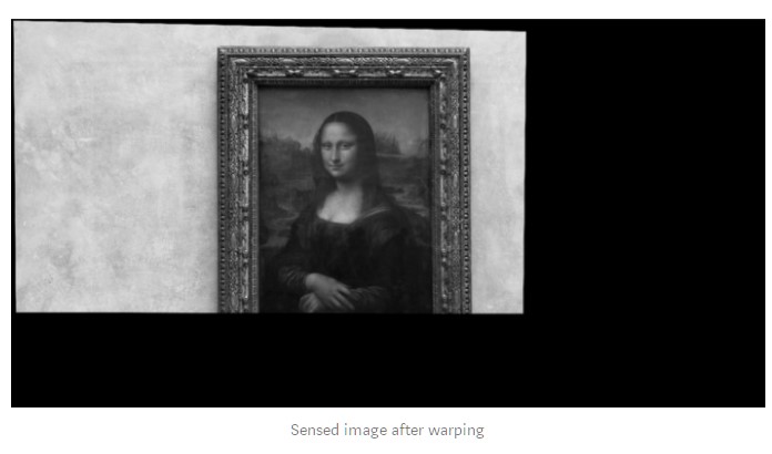 After matching at least four pairs of keypoints, we can transform one image relatively to the other one. This is called image warping. Any two images of the same planar surface in space are related by a homography. Homographies are geometric transformations that have 8 free parameters and are represented by a 3x3 matrix. They represent any distortion made to an image as a whole (as opposed to local deformations). Therefore, to obtain the transformed sensed image, we compute the homography matrix and apply it to the sensed image.