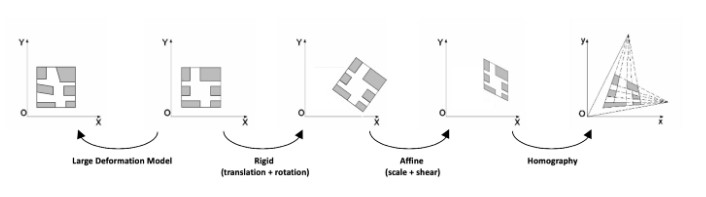 Image registration is the process of transforming different images of one scene into the same coordinate system. These images can be taken at different times (multi-temporal registration), by different sensors (multi-modal registration), and/or from different viewpoints. The spatial relationships between these images can be rigid (translations and rotations), affine (shears for example), homographies, or complex large deformations models.