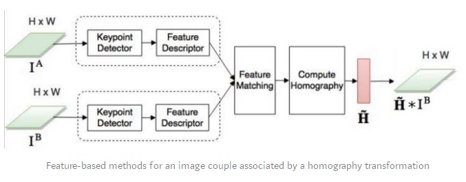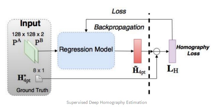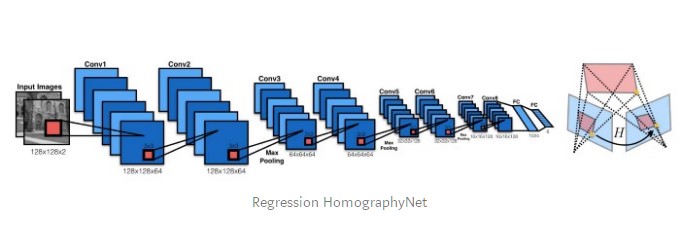 In 2016, DeTone et al. published Deep Image Homography Estimation that describes Regression HomographyNet, a VGG style model that learns the homography relating two images. This algorithm presents the advantage of learning the homography and the CNN model parameters simultaneously in an end-to-end fashion: no need for the previous two-stage process!