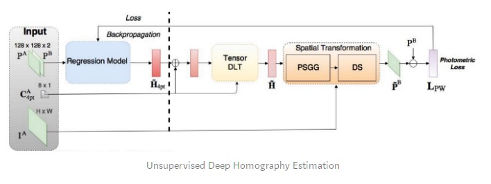 With this in mind, Nguyen et al. presented an unsupervised approach to deep image homography estimation. They kept the same CNN but had to use a new loss function adapted to the unsupervised approach: they chose the photometric loss that does not require a ground-truth label. Instead, it computes the similarity between the reference image and the sensed transformed image.