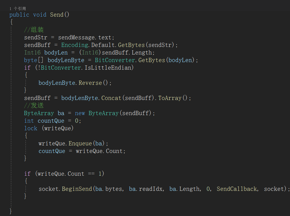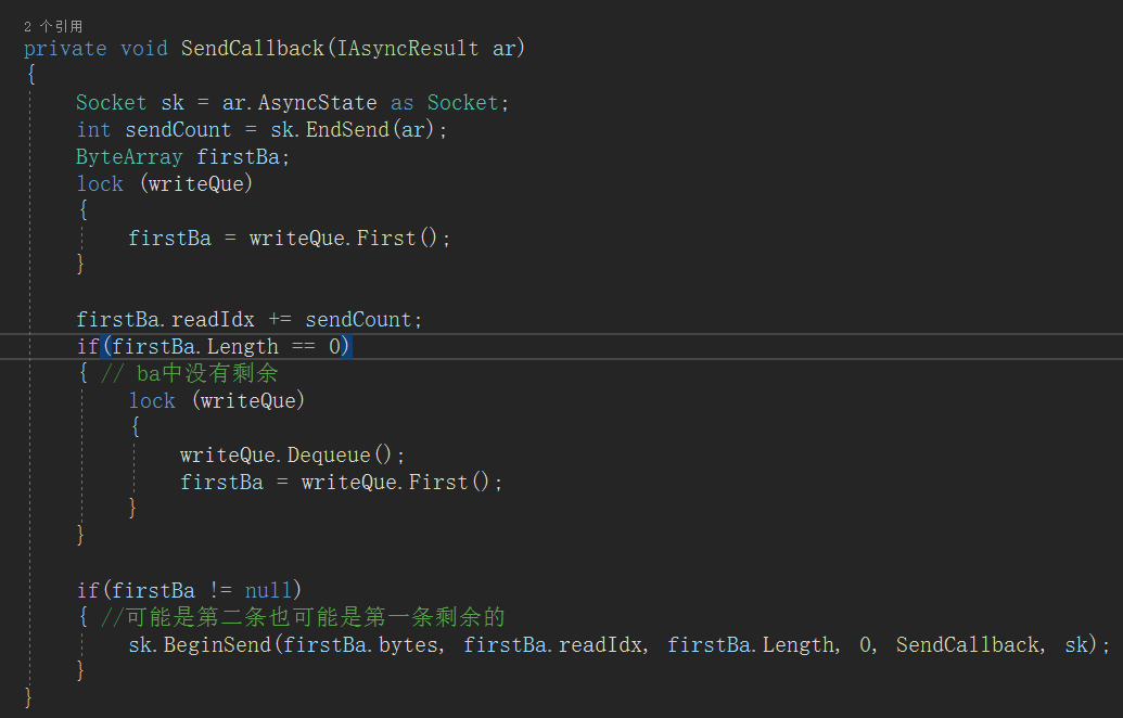 - 然后在SendCallback回调中,从队列取出第一个firstBa,根据实际发送字节长度更新firstBa的readIdx。如果剩余字节数firstBa.Length == 0,那么说明当前这条信息完整发送。将会这个ByteArray推出,然后取出下一个ByteArray。然后判断此时的firstBa是否为null(此时的firstBa可能是第二个ByteArray,也可能是第一个没有发送完整的),不为null将会继续发送