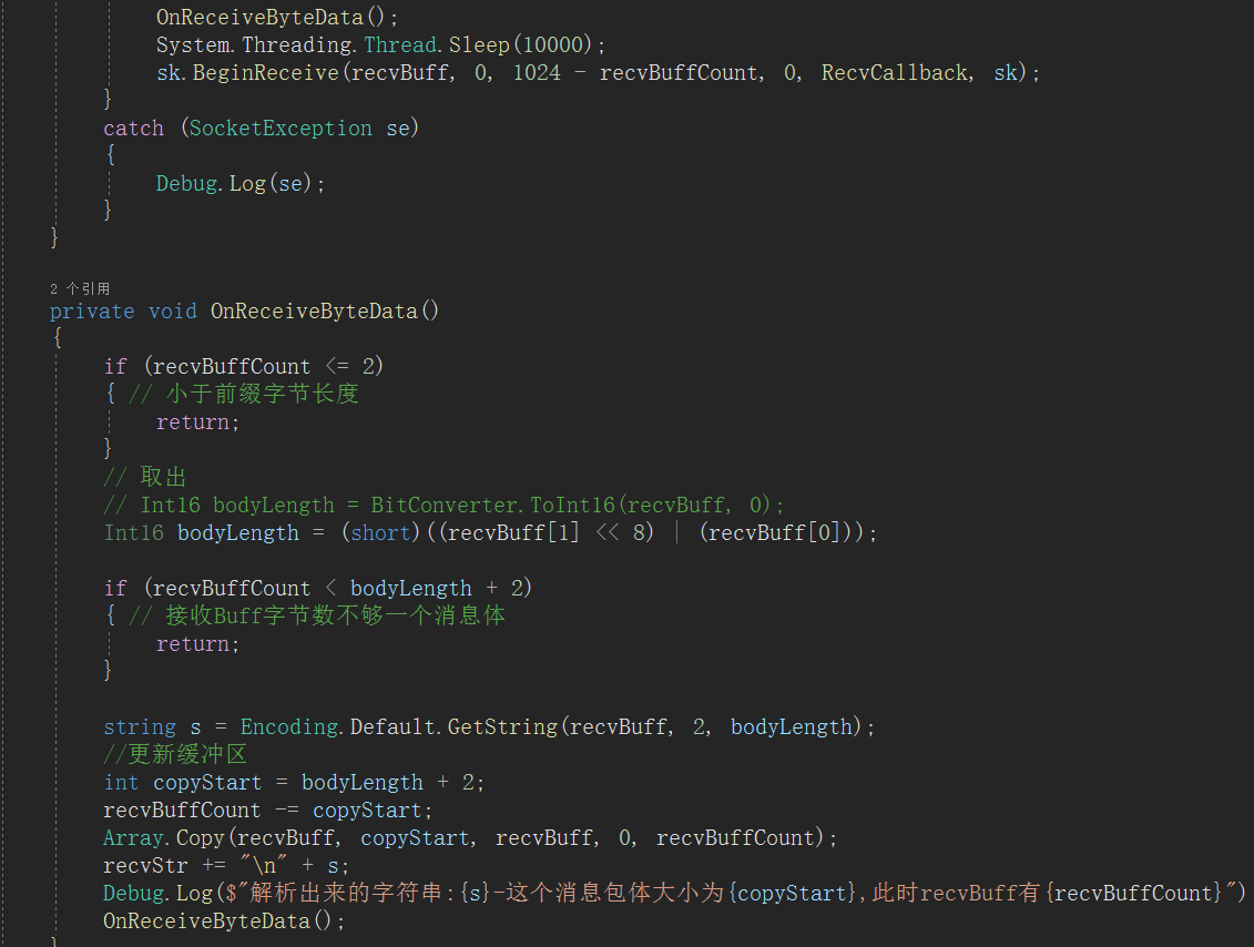 - 客户端首先定义recvBuffCount标识当前recvBuff有多少字节数据,在接收到数据时,将会把此次数据长度加到recvBuffCount上。然后调用OnReceiveByteData处理数据。