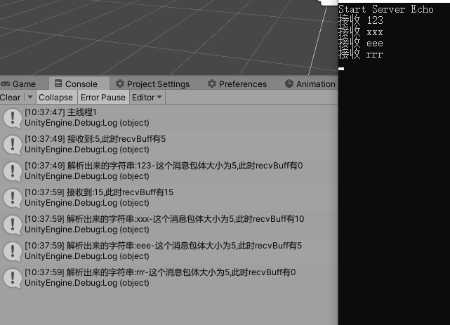 - 这里客户端在RecvCallback使用了System.Threading.Thread.Sleep(10000);阻塞了子线程,来模拟客户端粘包的情况。下图可以看到服务端接收了3条消息。客户端会先显示123,然后等待10s后开始接收并解析剩余的消息。