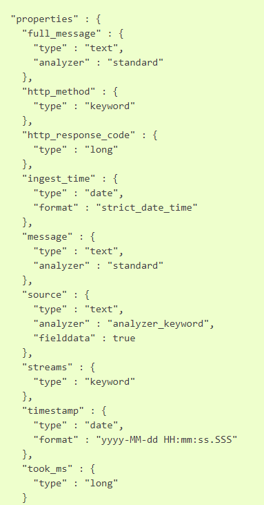Graylog本身是使用默认映射包括用于设置timestampmessage,和source索引的消息的字段:pretty’],},},},},},],},},},},},},},},为了扩展 Elasticsearch 和 Graylog 的默认映射,您可以创建一个或多个自定义索引映射并将它们作为索引模板添加到 Elasticsearch。假设我们有一个数据架构,如下所示:| 字段名称 | 字段