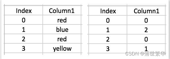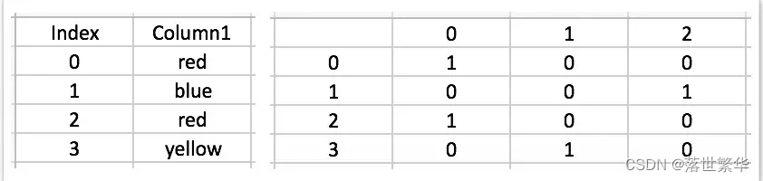 - 例如,[red, blue, red, yellow] = [1,2,1,3] 会被转化成3列用0和1表示的数据列