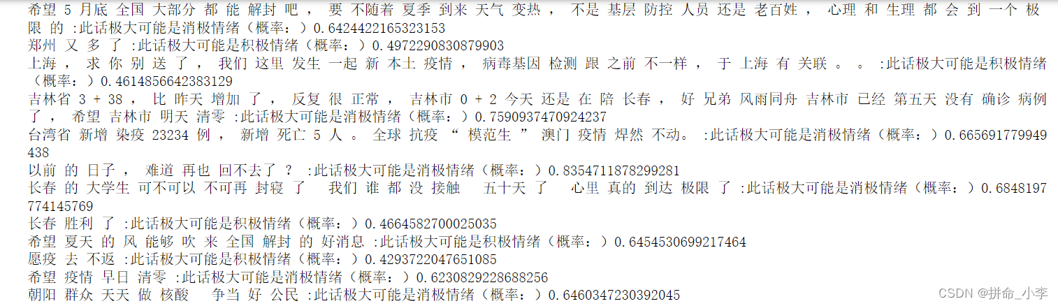 print(text,":此话极大可能是消极情绪(概率:)"+str(proba[0]))