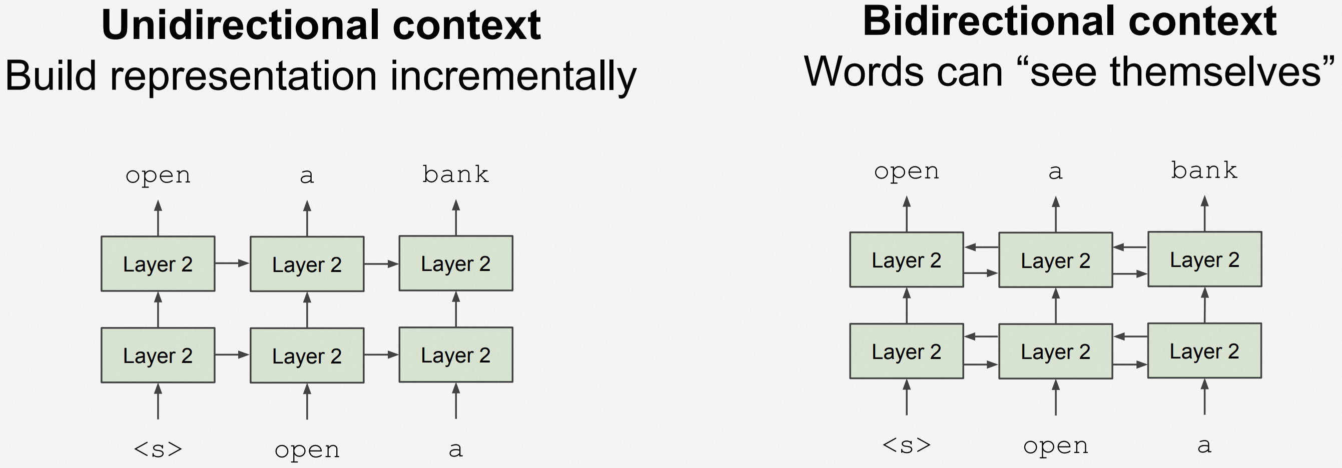 ELMo 用了 BiLSTM,对于任何一个输入文本,用一个 Left-to-Right 的单向 LSTM 模型和一个 Right-to-Left 的单向 LSTM 模型,从而避免了「See-Themselves」问题