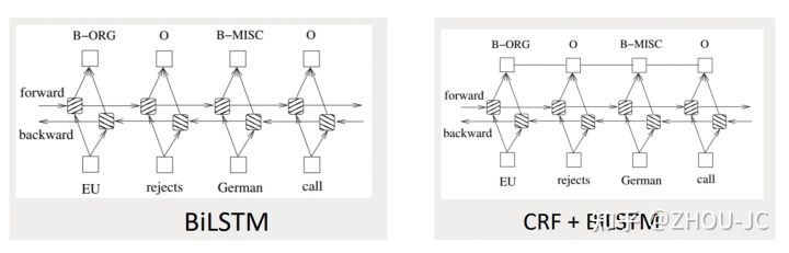双向的LSTM后面接softmax,但此时输出标签之间是没有关系的,加了CRF后,可以建立起输出标签之间的关联关系。
