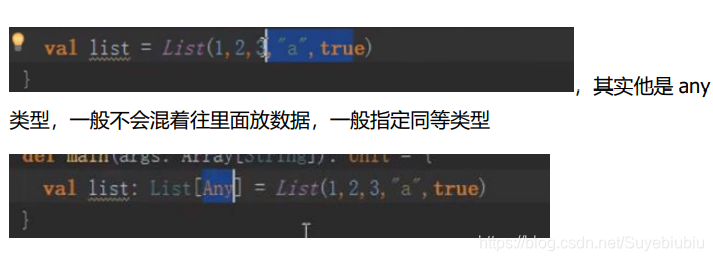 val list = List(1,2,3,4) ,也可以混着往里面写数据,都是不可变类型,修改里面 数据一般会返回一个新的 List