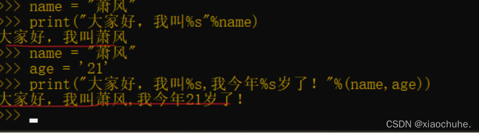 %s相当于就是替换字符串的意思,以第一个为例,print("大家好,我叫%s"%name),他的意思是,把%s所在的位置的值替换成%后面指定的字符串name打印出来;同理第二个例子是打印两个字符串,还是把%s的地方依次用%后面的字符串替换掉。