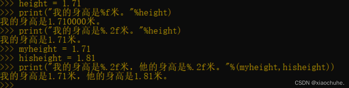 %f相当于就是替换浮点数的意思,以第一个为例,print("我的身高是%f米。"%height),他的意思是,%.2f代表指定保留两位小数。把%s所在的位置的值替换成%后面指定的字符串height打印出来;同理第二个例子是打印两个字符串,还是把%f的地方依次用%后面的字符串替换掉。