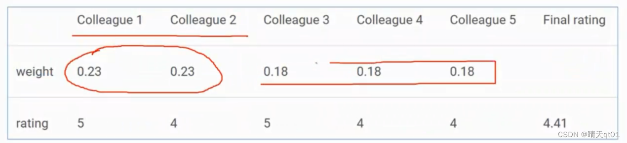 比如你的两个同事是评价专业者,其他同事则没有这个经验。那么这两个同事的评价就相对重要些。