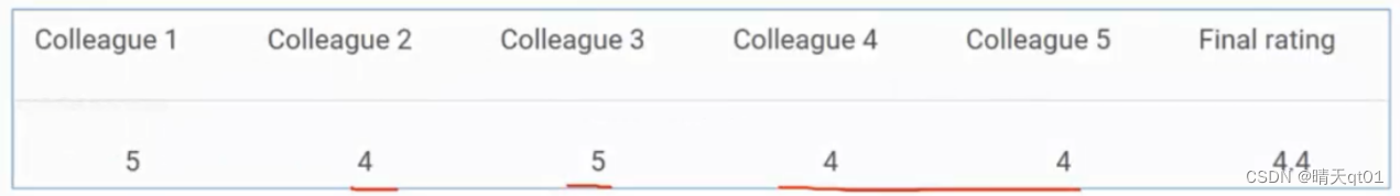 例如我们现在让5位同事评价你的电影,2个5分,3个4分,所以最终认为取结果众数。