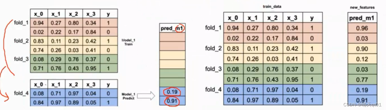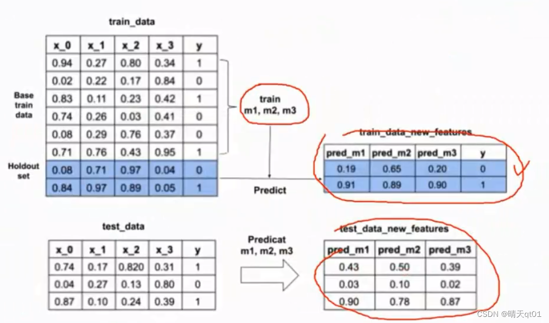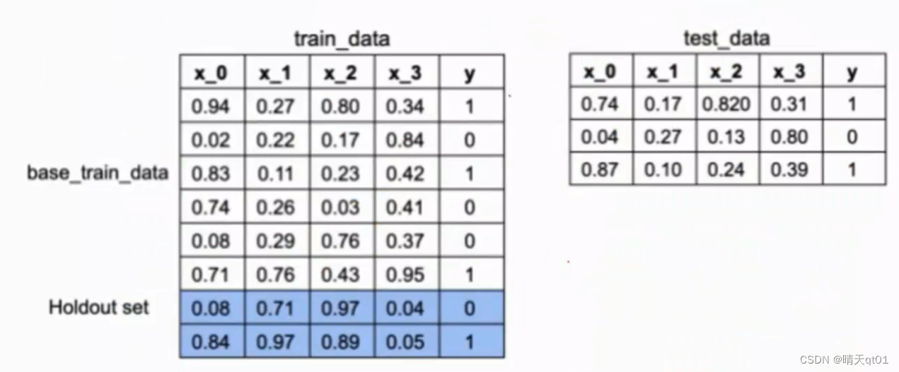 首先我们把数据分为2部分,训练数据集合测试数据集,训练数据集再分为两个部分,base_train_data 和holdout set