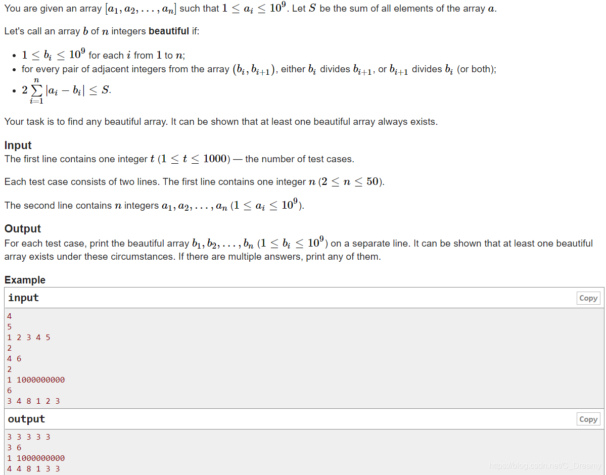 构造一个美丽数组 b,要求在 b 数组中,任意两个相邻的数必须满足小的数整除大的数从第一个条件下手,很容易想到 1 a[2] 1 a[4] 1 的构造方法在验证算法正确性,其中将 a[2] a[4] 看作整体,a[1] a[3] a[5] 看作整体,一定有一方大于另一方,或者两者相等,所以成立const int N=2e5+5;int n,m;int i,j,k;int a[N];int t[N]