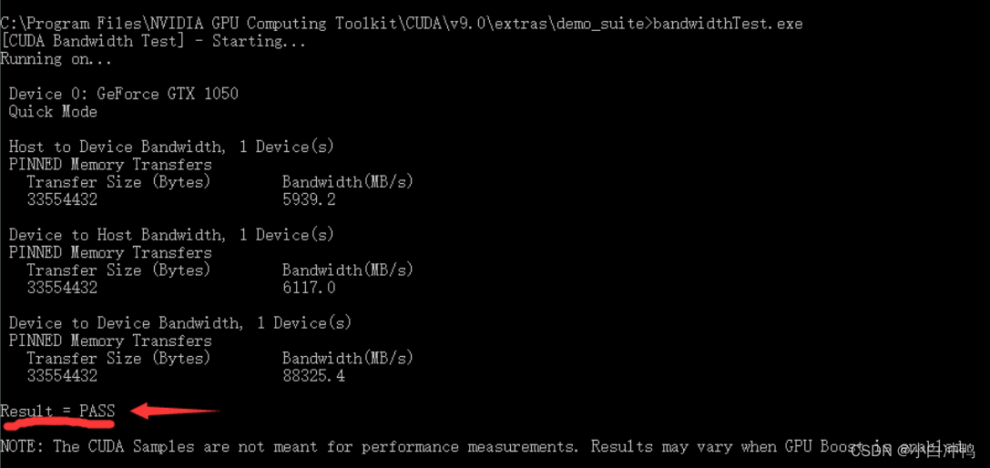 然后cd 到C:\Program Files\NVIDIA GPU Computing Toolkit\CUDA\v9.0\extras\demo_suite (这是默认路径),分别执行bandwidthTest.exe和deviceQuery.exe命令,分别返回下面两张图的结果,