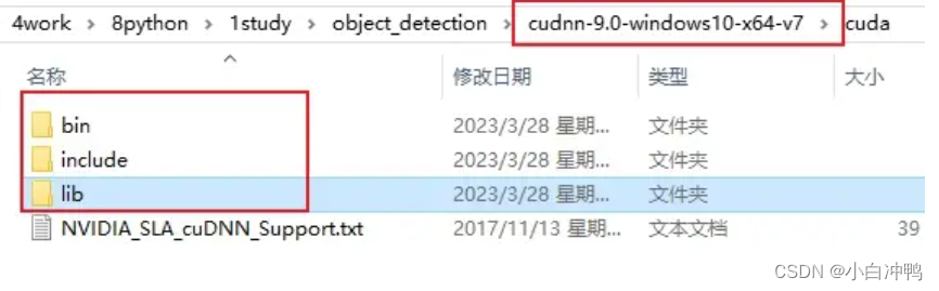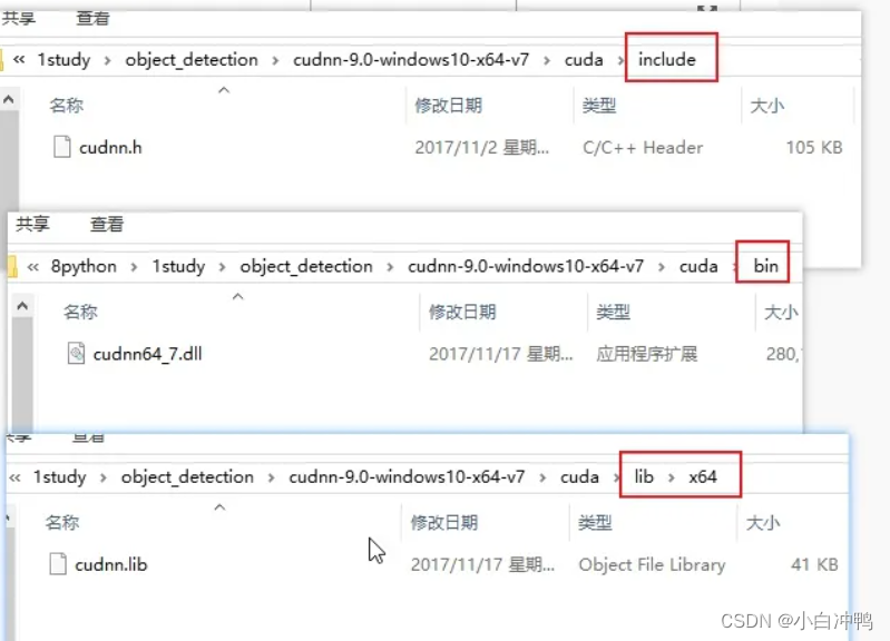 最后在cuda安装目录下的bin、include和lib目录下分别能找到上图三个文件,就说明cudnn安装好了。