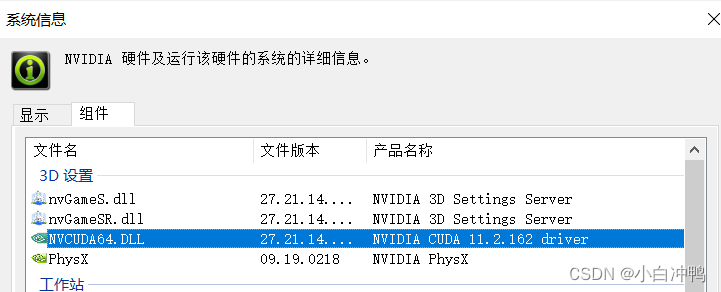 要查看电脑的显卡版本,首先在桌面右键选择NVIDIA控制面板(如果没有的话可能是因为你的电脑不支持GPU),然后选择帮助下的系统信息,在弹出的对话框中选择组件,然后就可以看到你电脑显卡支持的最高cuda版本(我这里是11.2.162,关键看前两位就行,即11.2,这就是说,我下载的cuda版本不能超过11.2)