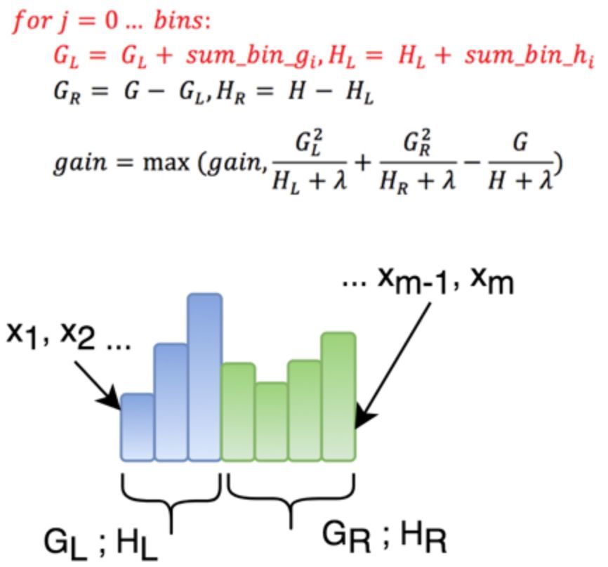采用直方图的方式,会在预处理阶段对特征值进行分桶。特征分桶处理后,只需要遍历每一个桶,分桶后的计算时间复杂度为O(#bins)。分桶操作后,可能找到的不是最优的分裂阈值,但是一个优点是能降低过拟合的风险。可见,采用特征分桶然后再进行寻找分裂阈值能够大大减小时间复杂度。
